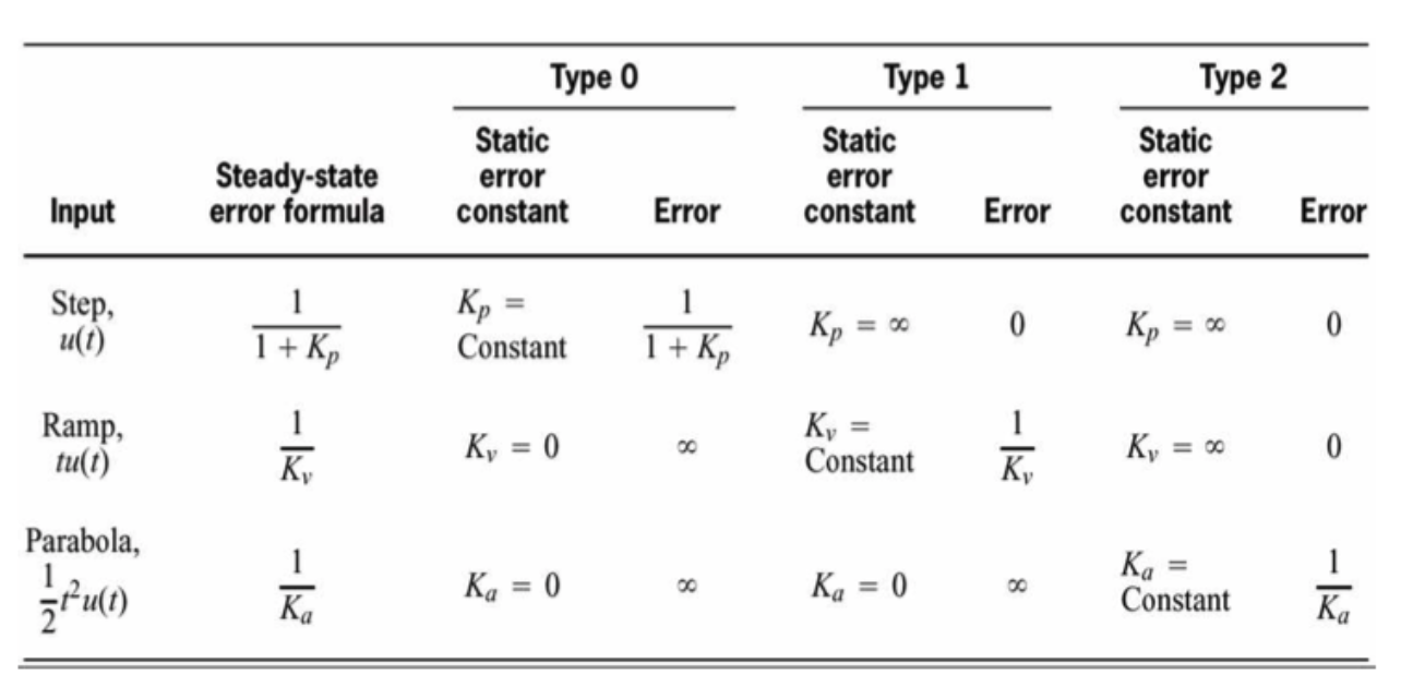 아래의 표는 각각 Step, Ramp, 그리고 Parabola Input 에 대한 시스템에 따른 에러와 K의 값을 나타냅니다.