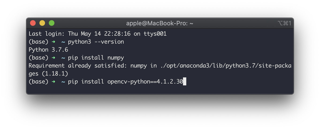 시간을 가지고 기다려줍시다. Mac Catalina에서는 OpenCV 최신버전이 제대로 작동하지 않는다는 이슈가 있으므로 구버전을 설치해줍니다.