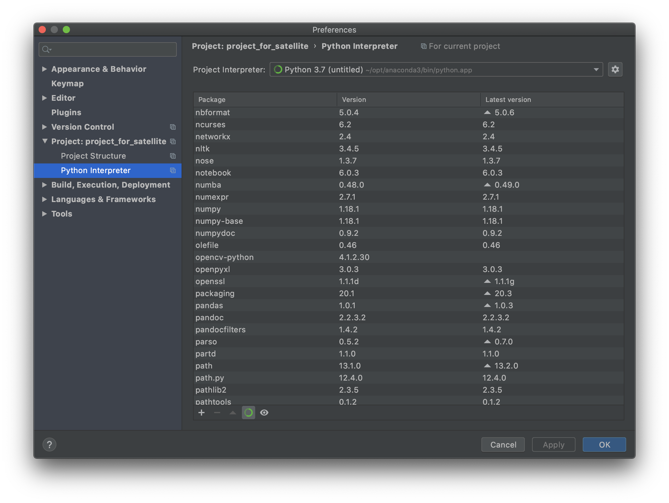 Preferences를 들어간 후 Python Interpreter에서 확인 가능합니다.