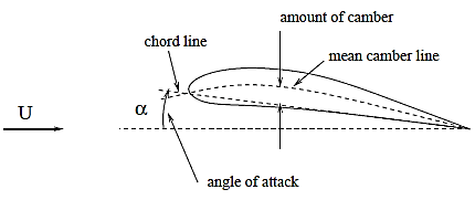 위는 에어포일의 구조이다. 사진에는 써있지 않지만 맨 앞은 Leading Edge라하고 맨 끝은 Trailing Edge라 한다. 또한 날개의 끝에서 끝의 거리를 chord라 하며 c라고 축약하여 포기한다.