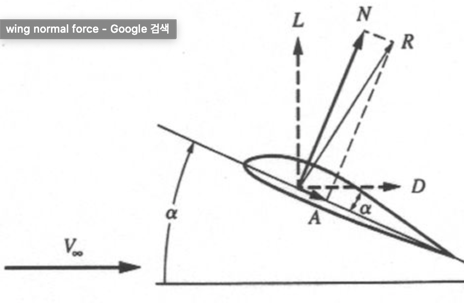 여기서 좀더 들어가자면 날개에대한 힘 두가지를 유도할 수 있다. N은 Normal Force 라하고, A는 Axial Force라한다. N과 A가 이루는 R값은 Lift와 Drag가 이루는 R과 동일하다 위의 관계는 받음각에대한 삼각함수로 표현할 수 있다.
