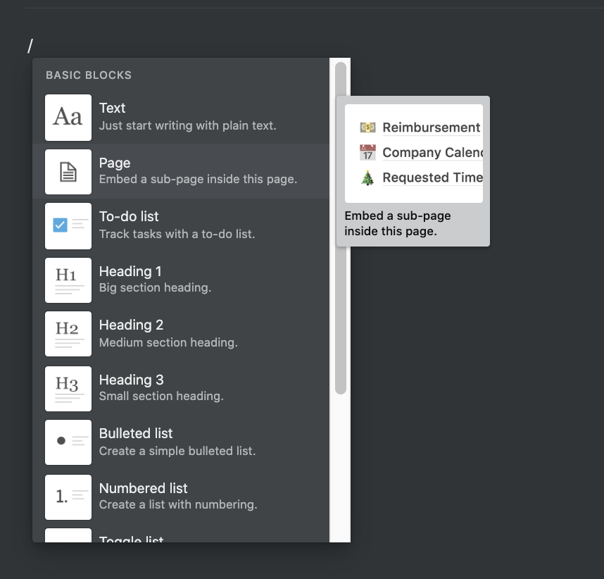 노션(Notion)은 "/"를 누르는 것만으로도 사용자들에게 많은 기능들을 한눈에 볼 수 있게 해준다. 단순 마크다운 문법처럼 아무런 가이드라인이 써있지 않다면 어려울 수 있지만, 이미 많은 사용자들이 수많은 Notion 사용법을 글과 Youtube로 남겨놓았다.