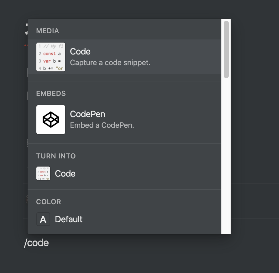 코드블럭을 만들고 싶다면 /code만 입력하면 된다. 그리고 코드입력을 지원하는 언어는 수도없이 많으므로 사용자가 쓰는 언어가 지원목록에 없을일은 없을것이다.