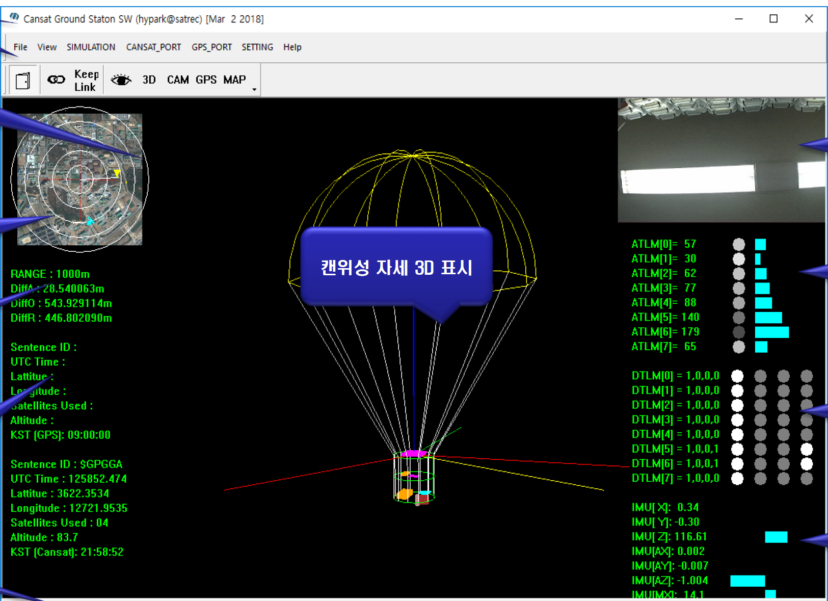 제가 속해있던 팀의 미션은 다음과 같았습니다. 캔위성에서 탐지 신호 및 GPS, 자이로 신호를 송신하면 지상국에서는 이를 받아 시각화 해주기로 했습니다.