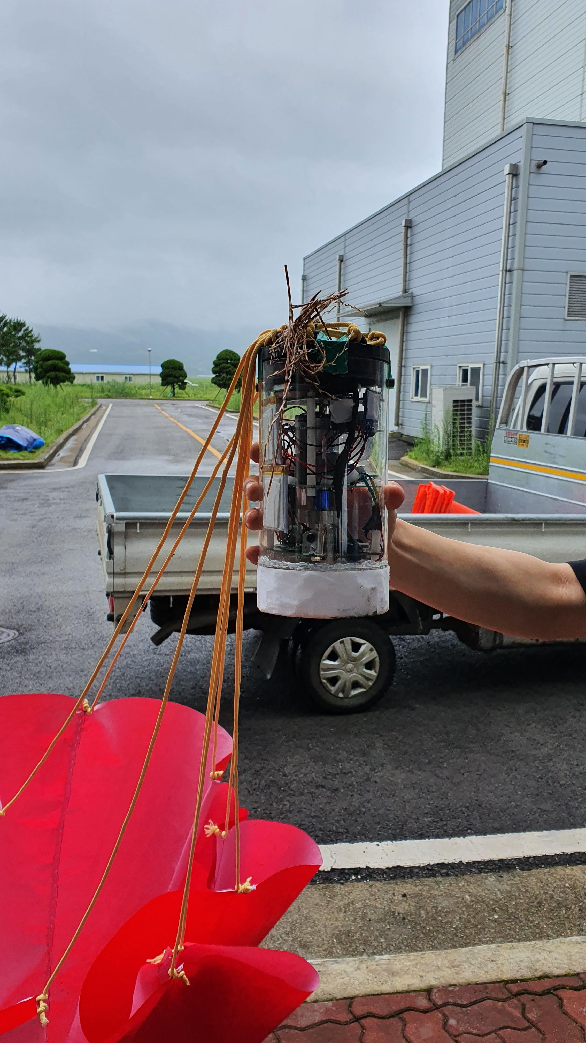 캔위성이 낙하하면 수거팀에서 수거를 하는데 저의 팀의 캔위성은 매우 튼튼하여 생채기도 나지 않았습니다.