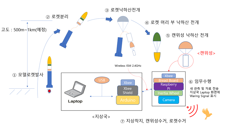 캔위성은 다음과 같은 로켓발사체에 실려 고도 500m정도에서 자동으로 페이로드가 분리되어 낙하하게 됩니다.