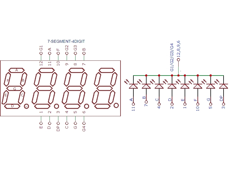 LED소자 7개로 숫자를 표현하기때문에 7-Segment라고 부른다. 소수점을 포함하는 DP단자까지 표현하면 총 8개의 LED로 구성되어있다.