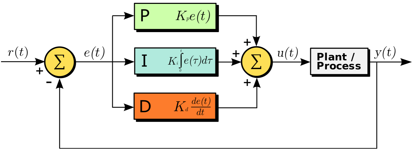 $$ u(t) = K_p e(t) + K_i \int^{t}_{0} e(\tau)d\tau + K_d \frac {de(t)} {dt} $$