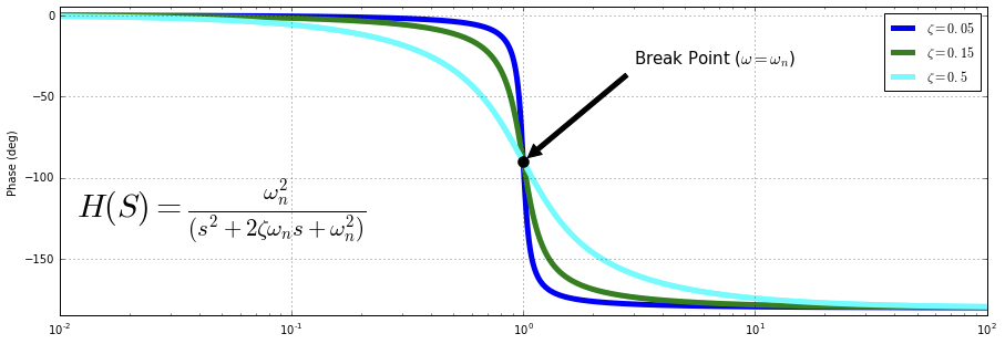 Slope closes $0\degree$ at $\omega \approx \frac {\omega_n} {5^{\zeta}}$, $-180\degree$ at $\omega \approx \omega_n5^{\zeta}$,
